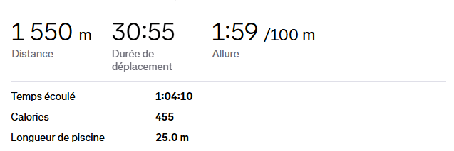 J’ai réussi à parcourir 1 550 mètres au total, bien au-delà de mes attentes. Ce n’était pas facile sans connaissances techniques. Heureusement, en échangeant avec d’autres nageurs, j’ai pu ajuster mes mouvements et ma respiration. Cependant, je ressens encore le besoin de progresser physiquement pour enchaîner deux longueurs sans m’arrêter. Malgré tout, je suis fier de moi : dépasser mon objectif initial de 1 000 mètres dès la première séance est une grande satisfaction.