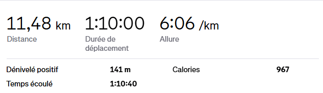 Les premiers kilomètres s’enchaînaient assez facilement, mais au fil du temps, la fatigue a commencé à se faire sentir. Malgré tout, je n’ai pas baissé les bras et j’ai réussi à boucler mes 1h10 de course. J’étais accompagné d’un ami, ce qui m’a vraiment motivé, surtout sur une sortie d’une telle durée.